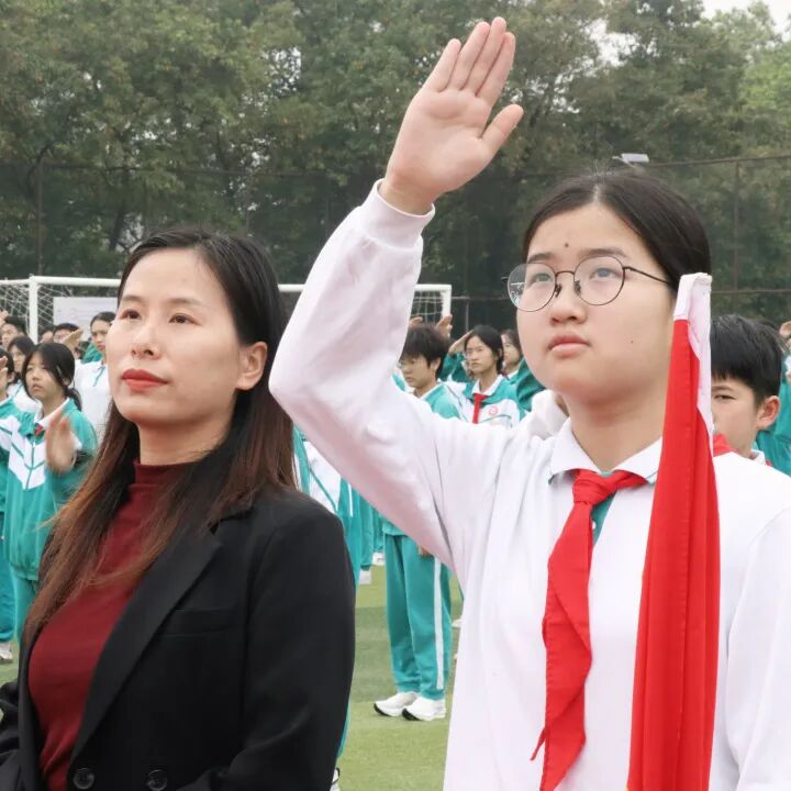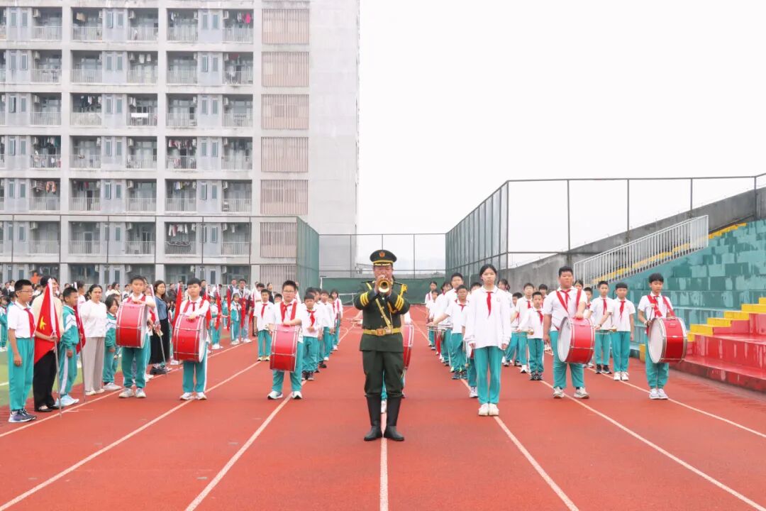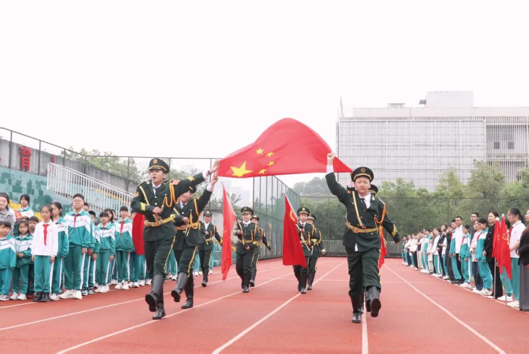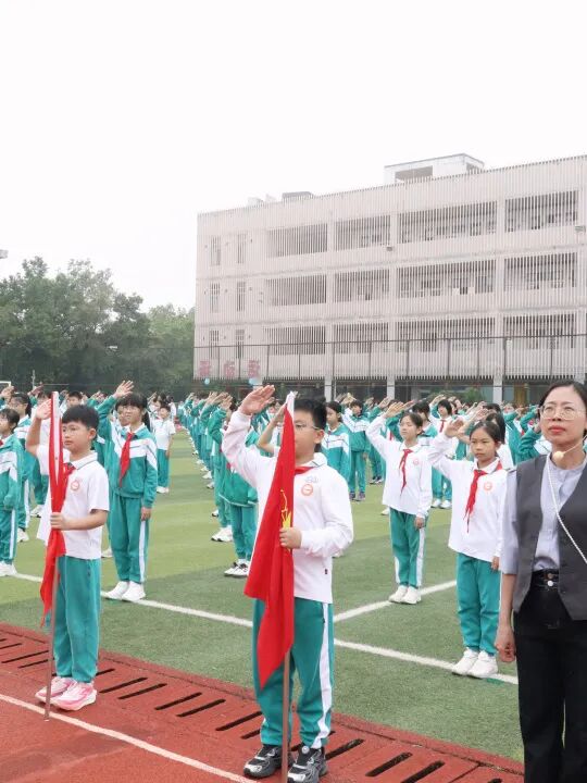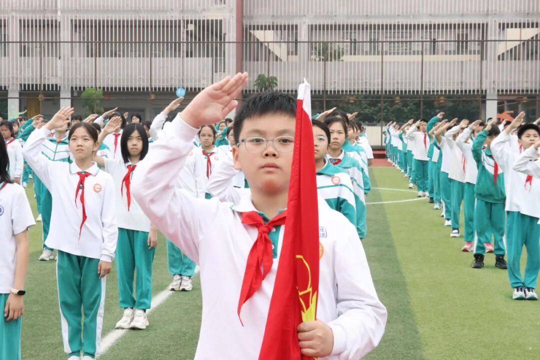 开学典礼在庄严的升旗仪式中启幕,小号嘹亮,鼓号齐鸣,全体师生肃立注目,少先队员行队礼。